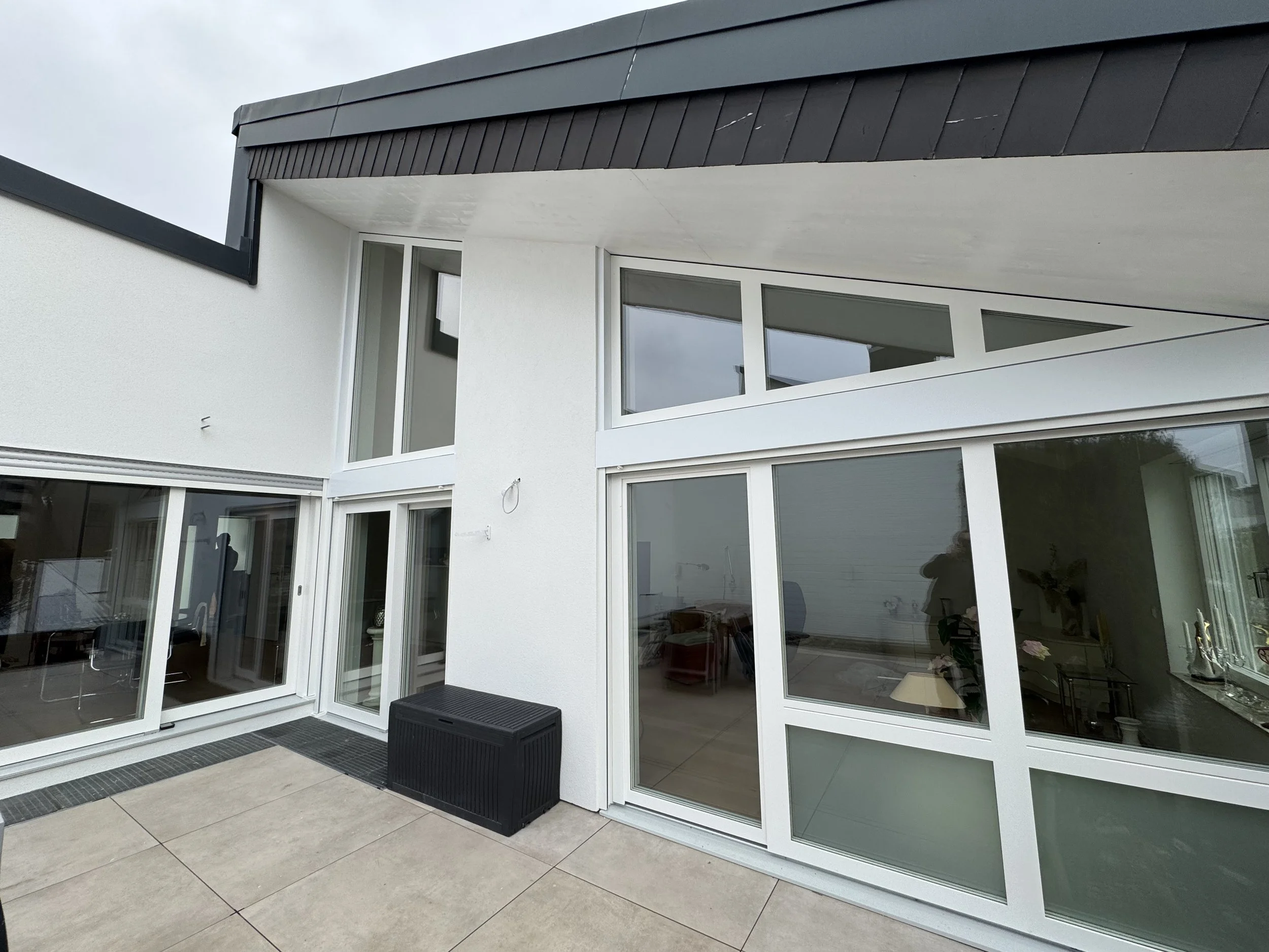Das Atelierhaus ist Teil einer städtebaulich anspruchsvollen Kettenhaus-Siedlung aus den 70er Jahren. Da sich erheblicher Reparaturstau angesammelt hatte und dem neuen Eigentümer die damals üblichen dunklen Farben der Fenster und der Ausstattung nicht mehr zusagten, wurde eine umfassende gestalterische und energetische Modernisierung durchgeführt.